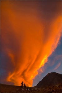 This image is entirely about the amazing cloud illuminated by Eastern Sierra sunset light. To capture it I found a single tree atop a ridge for the bottom of the frame, oriented the frame vertically, and gave the cloud over 80 percent of the frame. A horizontal orientation that captured this much of the cloud would have introduced distractions on the right and left, and shrunk the cloud significantly.