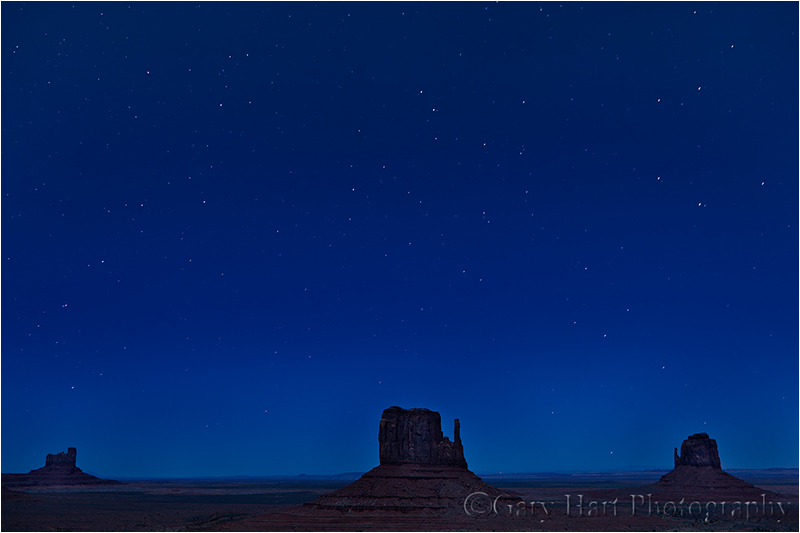 After a successful and satisfying week co-leading Don Smith’s Arches/Canyonlands workshop, Don and I detoured to Monument Valley on our way home. The evening of our arrival we hired a guide to take us to Teardrop Arch at sunset, but with cloudless skies and a 14+ hour drive home to Central California, we decided to pass on a sunrise shoot that was unlikely to yield anything the world hadn’t seen before. Instead, we rose at 4:30 to photograph Monument Valley by moonlight.