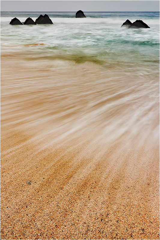 When photographing waves, once I get my composition set I click many frames, carefully timing them for various effects. On this evening I added a variable neutral density filter, dialing in a variety of shutter speeds by adjusting the amount of light. Watching my LCD, I decided that my favorite effect was a one second (or so) exposure of a receding wave, and managed several frames like the one above.