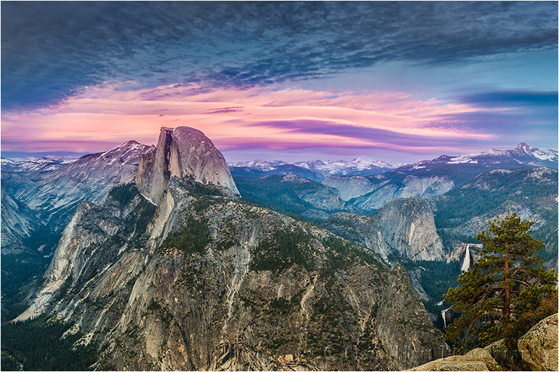 Because I already had plans for Mirror Lake, moonrise, and moonlight photography later in the workshop, I decided that the workshop’s first sunset was the best time time for the Glacier Point trip. Stopping first at Washburn Point just a short distance up the hill, we were treated to a harbinger of what was to come later–a mix of wave clouds and alto-cumulus above the Sierra crest to the east, and wonderfully warm light on Half Dome. Not knowing how long the light would last, I hustled the group to Glacier Point, arriving soon enough to get a front row seat for what turned out to be the best sunset experience I’ve ever had at Glacier Point.