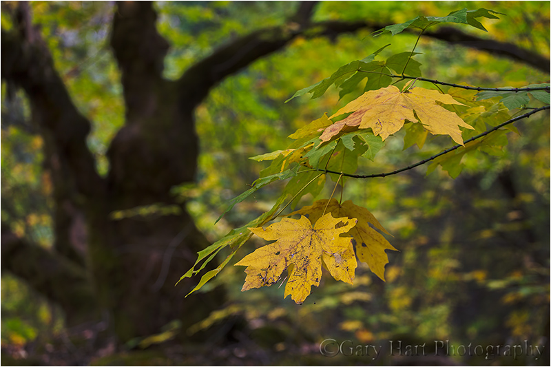 My lens of choice in these autumn leaves scenes is a telephoto, most often my 70-200 f4 because I almost always prefer its sharpness, speed, and ease of use over the extra reach of the 100-400. So, with 70-200 in place, I circled the leaves until I thought they aligned properly with the tree in the background. Removing my camera from my tripod, I framed the scene through the viewfinder, searching for the best relationship between the yellow leaves and brooding tree. I found that by dropping to the ground I could eliminate the less interesting foreground and frame my leaves with the curved branch.