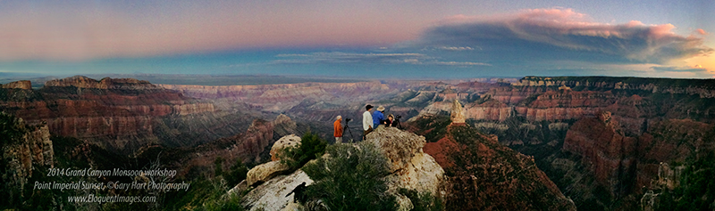 All this (finally) brings me to the above image from Point Imperial on my recent Grand Canyon trip. Point Imperial is probably my favorite spot on the North Rim. The railed viewing area isn’t quite large enough for an entire workshop group to work comfortably, but there are enough spots nearby that nobody is disappointed. My favorite location here is on the rocks, just below the railed vista, that jut about 1,000 vertical feet above the canyon. There isn’t a lot of room out here either, and very little margin for error, so after guiding the brave photographers who aren’t afraid of heights out to the edge, I found an out of the way spot a few feet behind them.