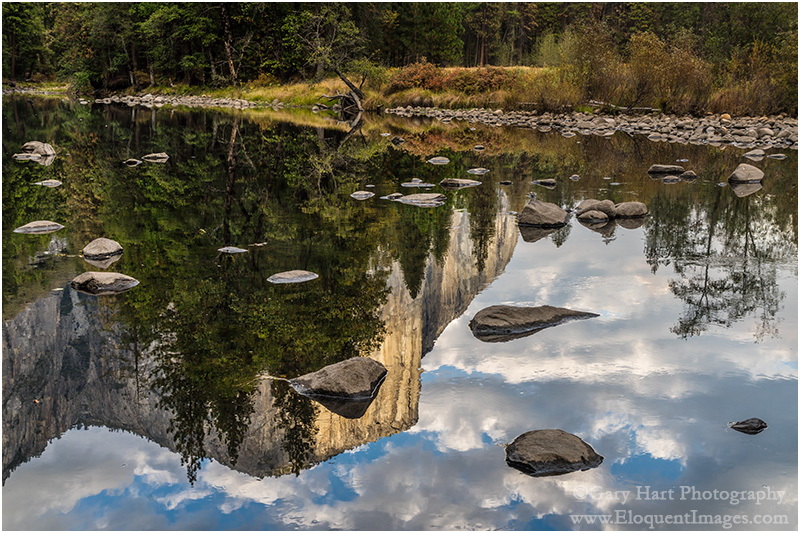 It also explains why I’ve been to Yosemite three times this month. The month’s first visit, with my Eastern Sierra workshop group, we photographed high Sierra reflections and a Half Dome sunset from Olmsted Point—we’d had lots yellow and orange aspen in the canyons above Bishop and Lee Vining, but it was a little early for Yosemite color. The next two trips were primarily focused on Yosemite Valley, ground-zero for autumn reflections. On both Yosemite Valley trips, the Merced River, always low and slow in autumn, was down far enough that I saw places I could have rock-hopped from one side to the other without getting wet.