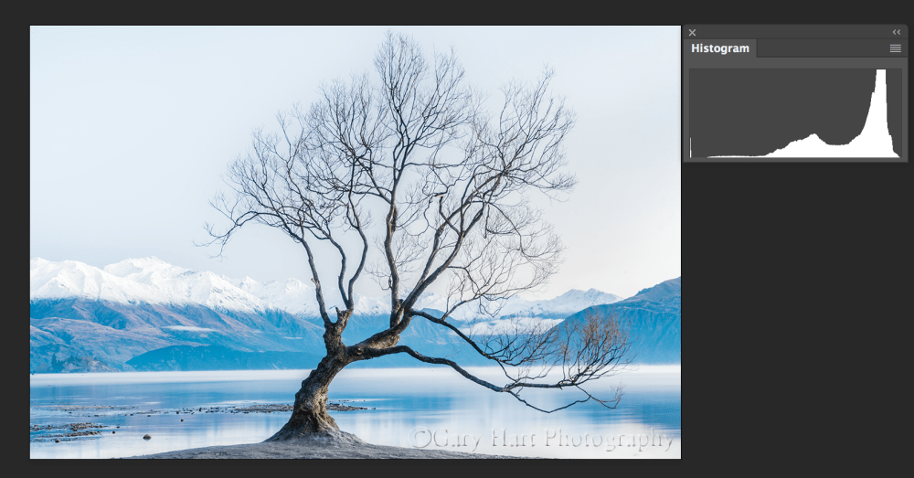 When checking an image’s histogram for exposure, your primary concern should be to ensure that the none of the tone data is cut off on the left (lost shadows) or right (lost highlights). If your histogram appears cut-off on the left side, shadow detail is so dark that it registers as black. Conversely, if your histogram appears cut off on the right side, highlight detail is so bright that it registers as white.