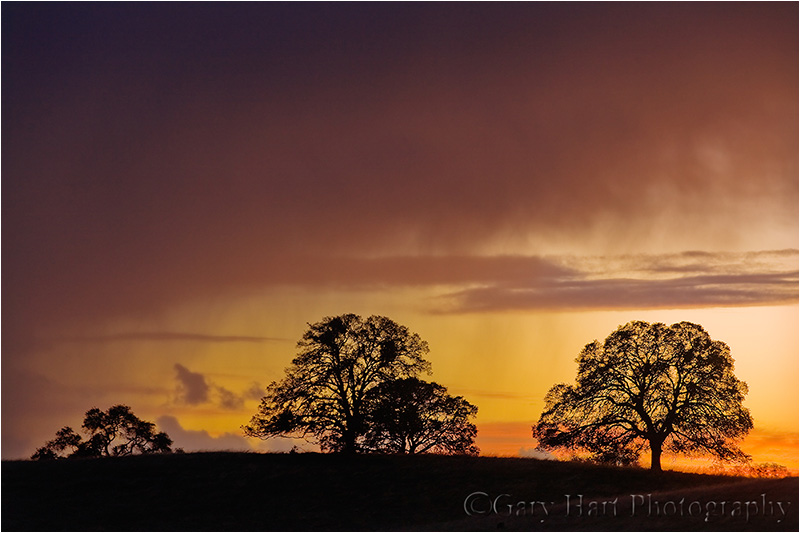Love falling rain and ominous rain clouds, and the orangey-purplely-black light and silouetted trees on a receding horizon, captured here. Nice one