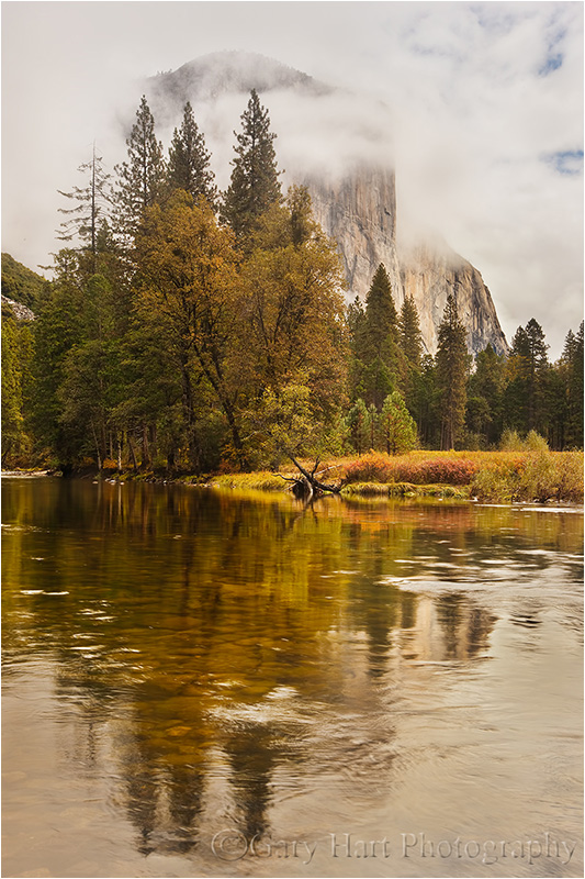 Today’s image is one such find. As a Yosemite photo destination, Valley View is probably second only to Tunnel View in popularity. I take all my workshop groups to Valley View, and usually can’t resist a peek when I’m in the park on my own, but rarely photograph there anymore. But on a visit a couple of autumns ago, finding the light and clouds irresistible, I set out to see if I could create something I didn’t have. With the clouds enshrouding El Capitan lending an air of mystery, I chose a vertical composition to eliminate less compelling surroundings. Rather than emphasize the almost irresistible reflection in the meandering Merced, I adjusted my polarizer to reveal the river-rounded rocks beneath the surface. The result was a high-key perimeter framing the darker scene that gives the frame a negative feel, where the darkest regions do the most work. Despite liking it as soon as it flashed in my LCD, I thought little more about this image until I stumbled upon it last week. While this won’t likely be the image I retire on, at the very least it nudged me into digging a little deeper on my hard drives to see what else might be out there. Stay tuned….