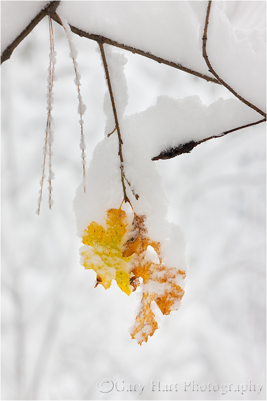 I arrived at Valley View that afternoon to find it blanketed with fresh snow—had I opted for the obvious composition, I’d have captured a gorgeous version of something that’s already been captured thousands of times. But I wanted something different, so I headed upriver a hundred feet or so to this dogwood I remembered from previous visits. (In fact, it’s the same dogwood featured in one of my favorite images.) I found that the sudden snow had caught the dogwood’s colorful leaves off-guard, leaving many still dangling from the snowy branches like frozen Christmas ornaments.