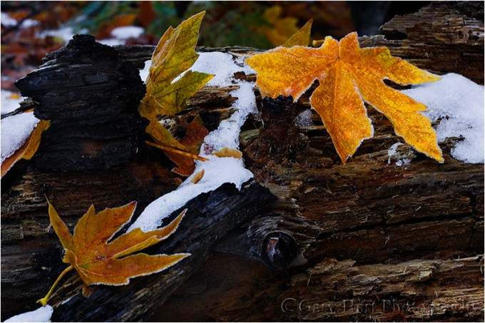So that November morning my attention turned to shocked autumn leaves, lulled by weeks of benign fall weather, forced to cling to their colorful glory against winter’s sudden assault. After nearly a month as the main event, these leaves were lone survivors along a quiet bend in the Merced River. Within a couple days they no doubt fell to the forest floor, or were swept into the river, as inevitable winter prevailed.