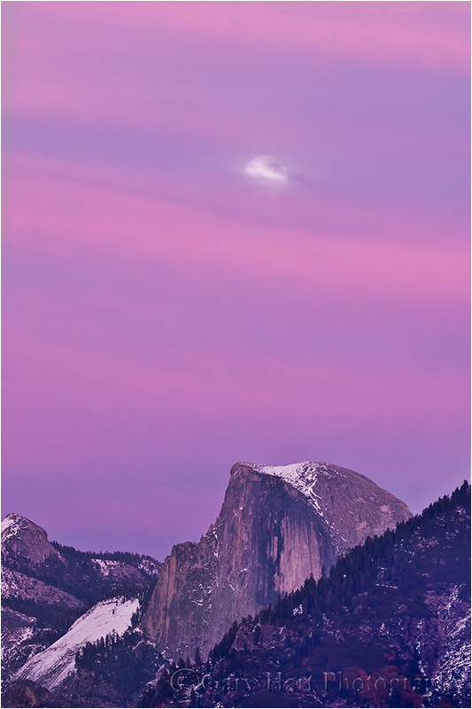 Last week I rose at 4:00 a.m. to photograph a thin crescent moon rising above Half Dome almost an hour before sunrise. It was one of those, “I’m witnessing the most beautiful thing on Earth” moments, and I couldn’t believe no one else was there to enjoy it. I arrived about fifteen minutes before I expected the moon to rise, more than enough time to set up one tripod with my 1DS III 100-400 lens bulls-eyed on Half Dome at 400 mm. Another tripod had my 5D III and 24-105 composed to include El Capitan and Half Dome (above).
