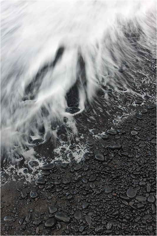 Because Maui and the Big Island have experienced the most recent volcanic activity (it’s ongoing on the Big Island), scenes like this are much more common than they are on the other major islands. I found these volcanic stones, polished smooth by sand and surf, on a small beach near Hana. I composed to capture the sea/land interaction that’s so easily overlooked in favor of the more dramatic surroundings. Once I found a composition I liked, I clicked twenty frames recording a variety of wave actions at different shutter speeds.