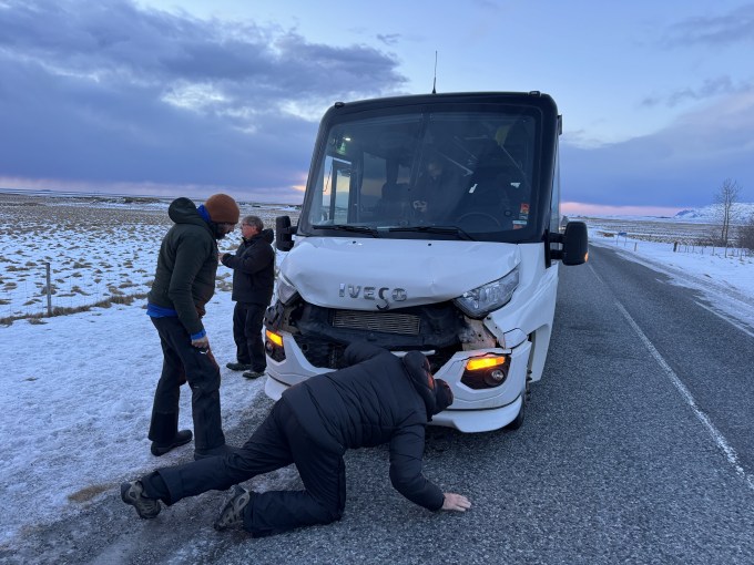 We immediately pulled over, all pretty shaken, but no one more-so than Vincenzo. After a minute or two to recenter, the four group leaders (Iceland guide Albert Dros, driver and photographer Vincenzo Mazza, Don Smith, and me), exited to assess the damage. There was no doubt that the reindeer was down for the count on impact, a small comfort to know that it didn’t suffer. But when I saw our headlights still shining bright before exiting, I’d held out slight hope that damage to the bus would be cosmetic and not impact our trip. No such luck.