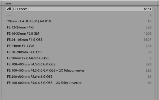 The lens choices we make say a lot about our vision in the field—what we see and how we chose to express it. So, to get a better idea of my own lens choices and maybe identify potential creativity-limiting biases, I created a 2019 lens-use report in Lightroom. Here’s a screenshot for that report detailing the number of frames I shot with each lens in my bag in 2019: