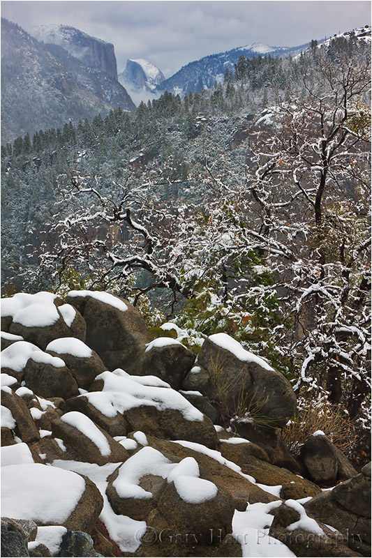 I’ve stopped here many times, but rarely photograph this view because it seems I always struggle with what to do with the foreground rocks and tree–composing wide enough to include them makes El Capitan, Half Dome, and Sentinel Dome quite small, and I just don’t think they’re interesting enough to occupy so much of the frame. But a couple of weeks ago, while guiding a private workshop student on a snowy morning, I found the entire scene etched in white and immediately saw the possibilities. Like magic, when adorned with a snowy veneer these foreground distractions became a worthy subject.